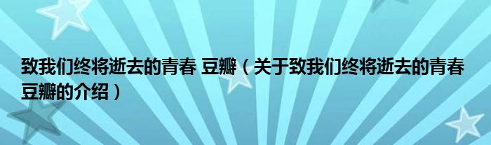 大家好,小乐来为大家解答以上的问题。致我们终将逝去的青春 豆瓣,关于致我们终将逝去的青春 豆瓣的介绍很多人还不知道,现在让我们一起来看看吧!